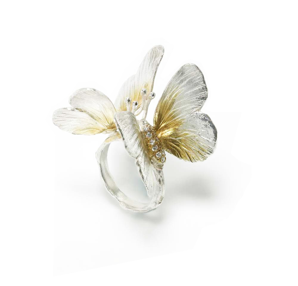 This ‘Double Moth’ ring is cast from life. It is made from silver and gold pen plating, with a pave diamond set body.
