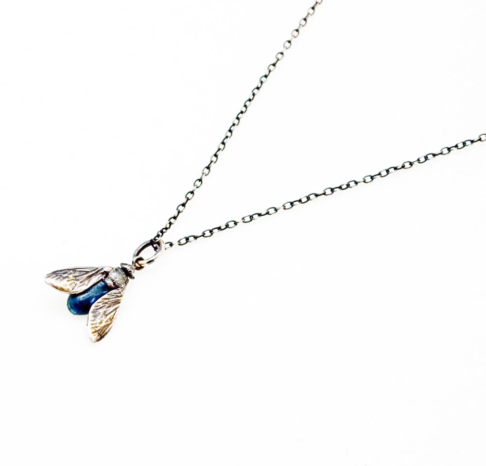 This ‘Fly’ necklace is cast from life.. It is made from oxidized silver and enamel, on an 18 inch chain.