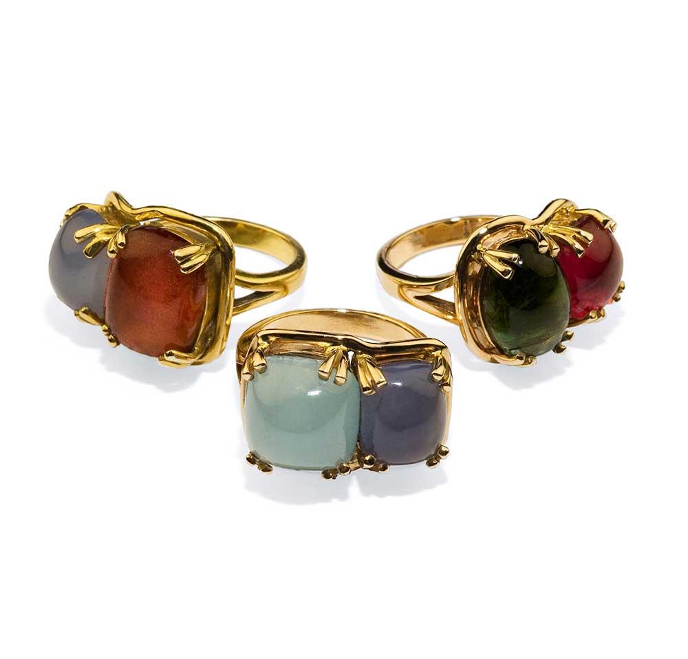These ‘Jelly Bean’ rings are made from 9ct yellow gold, set with cabochon cut multi coloured tourmalines.
