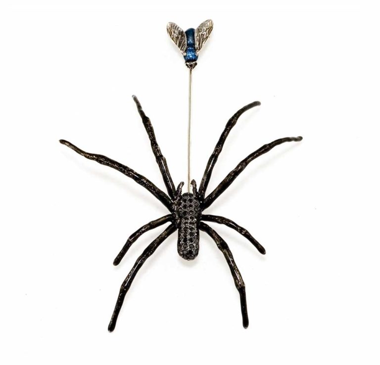 This ‘Spider and Fly’ pin is cast from life and made from oxidized silver, enamel and black diamonds.