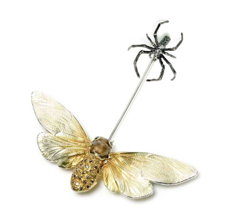This ‘Spider and Moth’ pin is cast from life and made from silver, with gold pen plating, enamel and cognac diamonds.