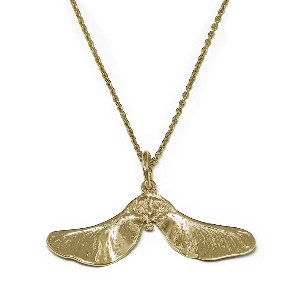 This sycamore pod necklace is cast from life. It is made from 9ct yellow gold (also available in white and rose 9ct gold) on an 18 inch chain